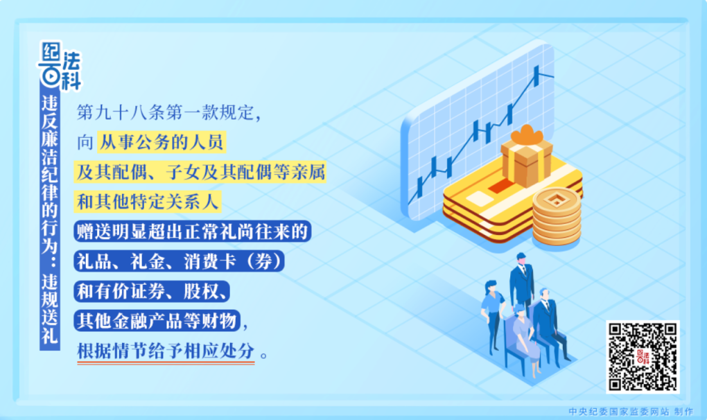 该款规定,向从事公务的人员及其配偶、子女及其配偶等亲属和其他特定关系人赠送明显超出正常礼尚往来的礼品、礼金、消费卡(券)和有价证券、股权、其他金融产品等财物,情节较重的,给予警告或者严重警告处分;情节严重的,给予撤销党内职务或者留党察看处分。